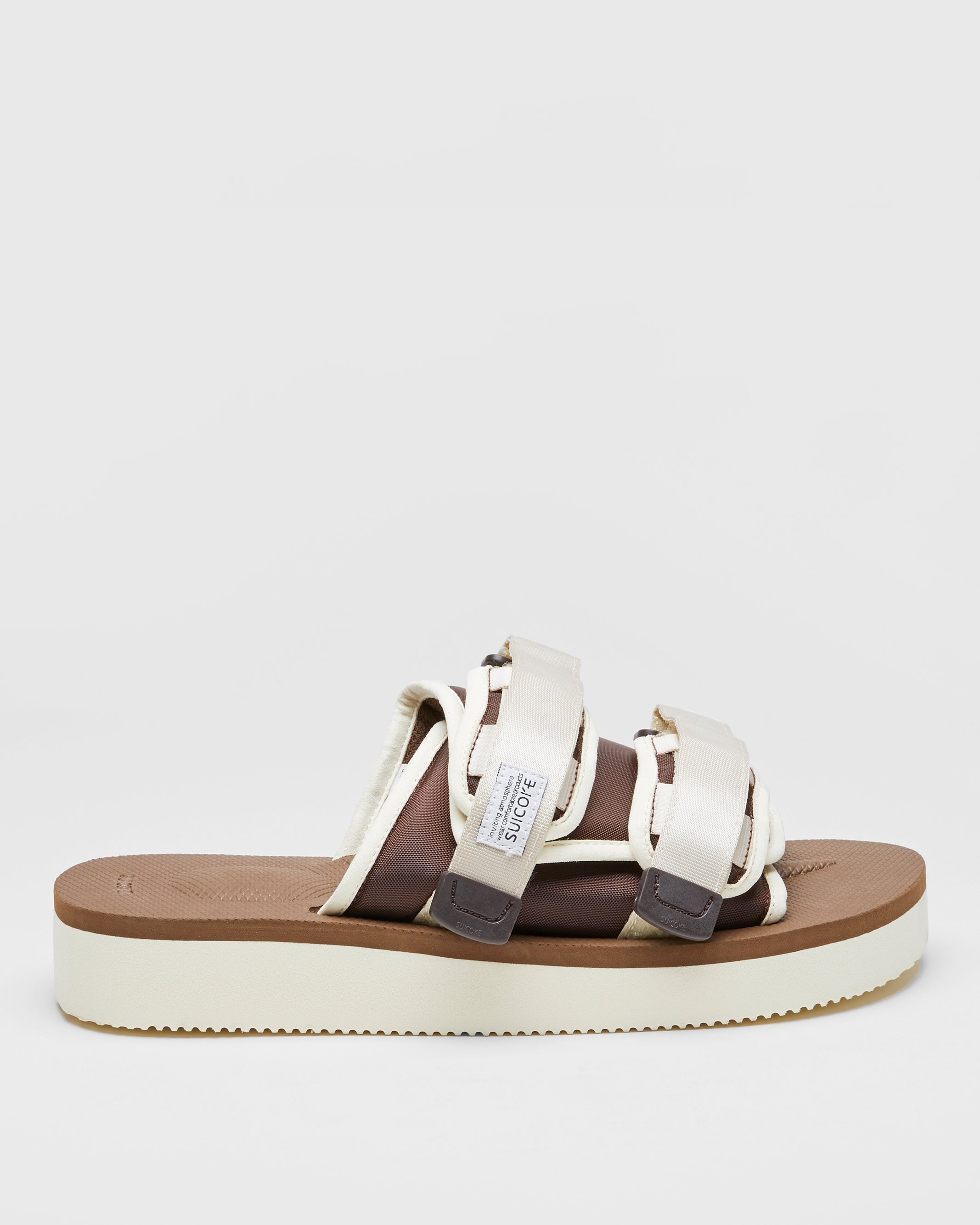 With an elevated sole, the MOTO-PO is a platform iteration of the popular style, with adjustable straps and the original SUICOKE EVA antibacterial footbed & outsole completing the design.